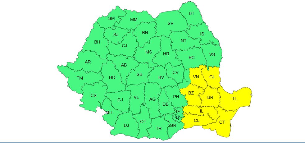Din această seară, de la ora 22.00 și până pe 31 ianuarie, ora 20:00, va fi în vigoare un cod galben în 8 județe din sudul Moldovei, jumătatea estică a Munteniei și Dobrogea. Aici, potrivit ANM, vântul va avea intensificări cu viteze la rafală în general de 50…65 km/h.
