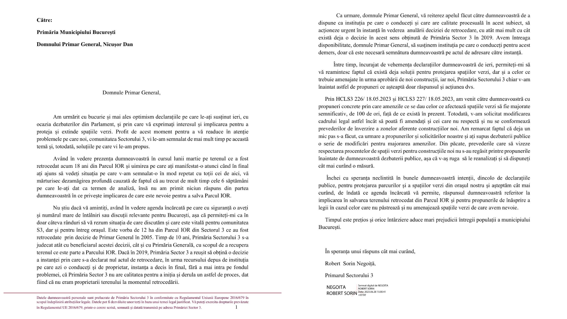 Pe data de 28 iunie, în jurul orei 16:00, Robert Negoiță a publicat pe Facebook o scrisoare deschisă către Nicușor Dan. Primarul Sectorului 3 din București acuză, prin intermediul documentului oficial, că edilul Capitalei nu s-a implicat spre salvarea celor 12 hectare din Parcul IOR. Văzând că nu este chip ca Primarul să-și respecte promisiunea, a apelat la varianta în care face întreaga poveste știută de toată țara.